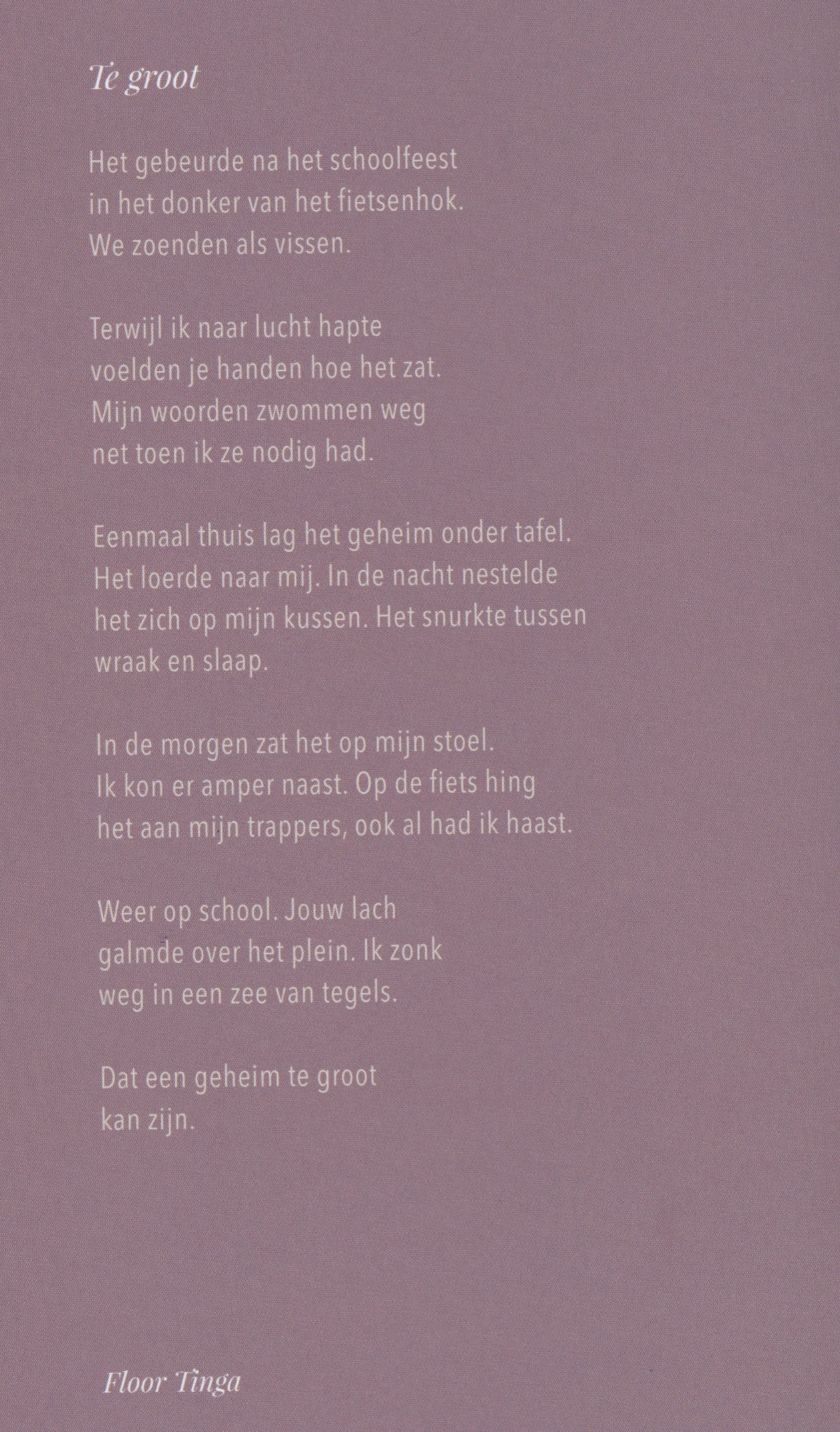 Een magische bundel over de dichters van dichter. Mijn gedicht Raad heeft een full spread gekregen met een illustratie van Hendrickje van Dijk. Bijzonder blij mee!